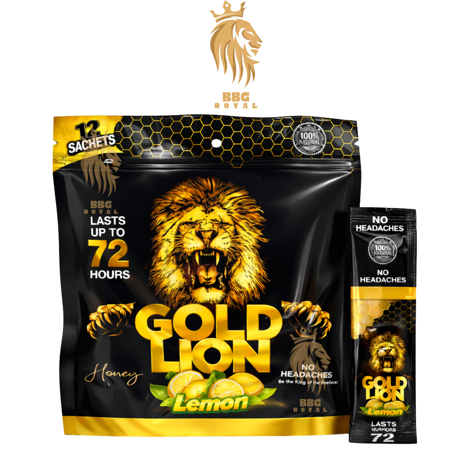 Gold Lion Honey Lemon is a premium honey-based supplement offered in convenient single-serve sachets. Each pack includes 12 individually sealed sachets, presented in a hanging retail pouch that’s easy to store, carry, or display.