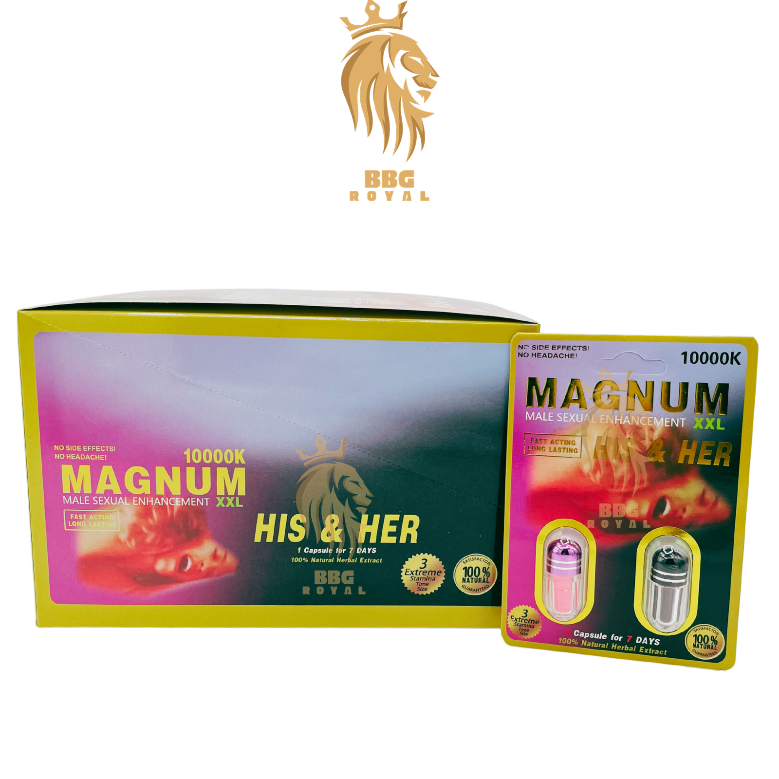 Enhance performance, stamina, and pleasure with Magnum XXL 10000K His & Her, a dual-action male enhancement supplement designed for both men and women. Featuring a fast-acting, long-lasting formula, this supplement improves prostate health, enhances sexual vitality, and boosts intimacy for both partners. Each capsule lasts up to 7 days, providing continuous support for peak performance. The box includes 24 packs, with 2 pills per pack (48 pills total), delivering sustained enhancement and satisfaction for couples.